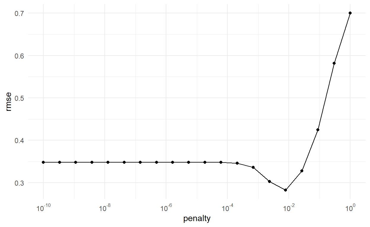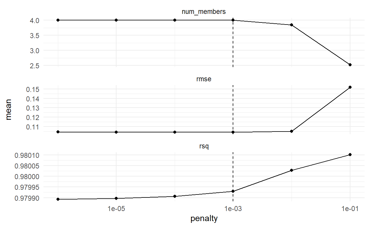 We can examine some plots to see if we need to adjust the penalty parameter at all. This set of three plots with penalty on the x axis shows that we seem to have captured the smallest RMSE.