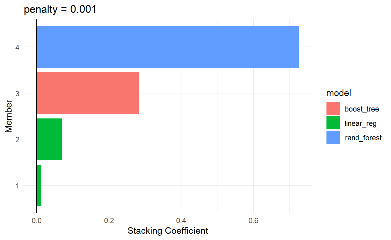 First, we created the stack. Shown by the number of columns, it removed some of the lasso models, likely since they were too similar to other lasso models. The set of candidate models now has 9 random forest, 9 lasso, and 9 boost.