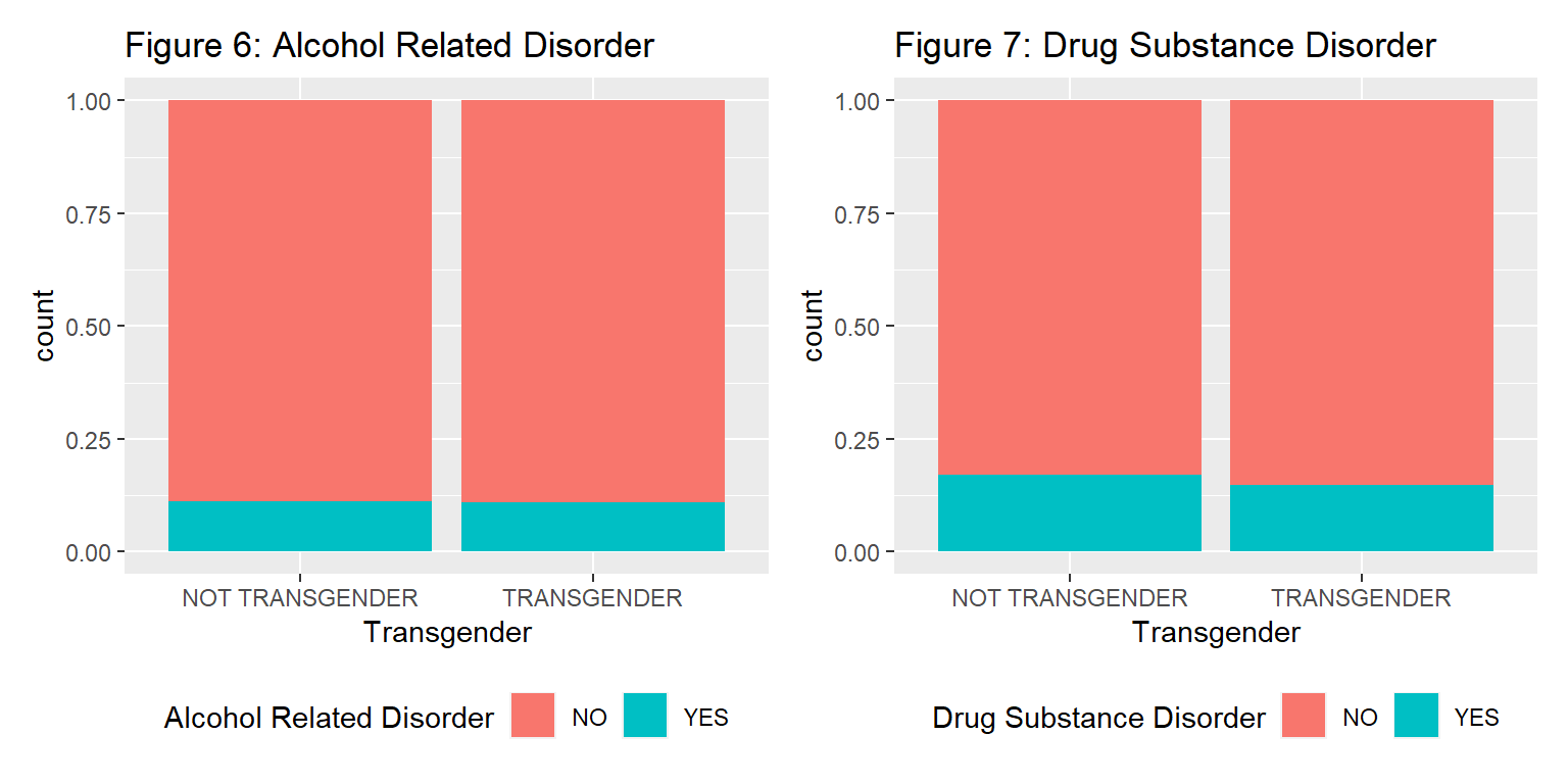 We can see that there is almost no visible difference between transgender and cisgender (not transgender) patients for any of the four mental health outcomes (figures 4, 5, 6, & 7). We also see that almost our entire sample has mental illness (figure 4), over 90% have serious mental illness (figure 5), and around an 8th have alcohol and/or substance disorders (figures 6 & 7).