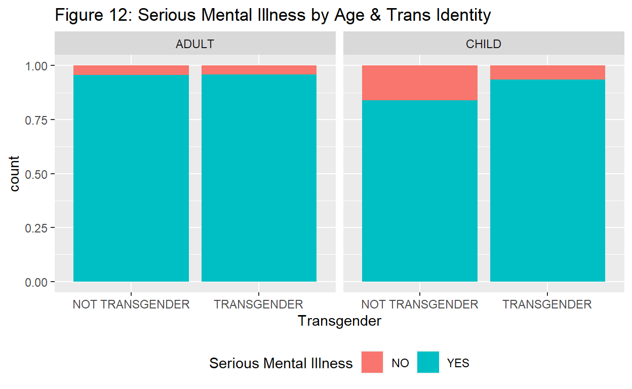 Because none of these outcome variables seemed more related to transgender identity than another, and because there were almost no patients without mental illness, we chose serious mental illness as our outcome variable.