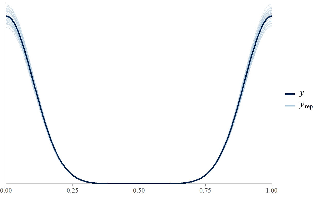 Although we now have a better understanding of the simulation outcome, we are still not sure how the model is doing. So, the next question is, how wrong is the model? pp_check shows that the prediction is close to actual data and the model is not wrong.